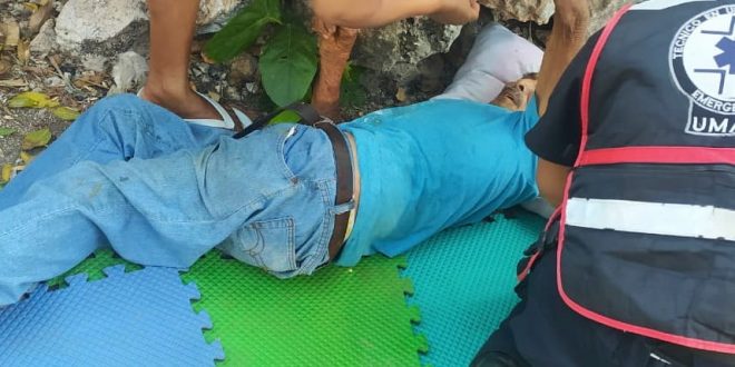 Por lo que Santos se asombró, pero le pidió que por favor baje, pues su padre se situaba a casi 4 metros. En eso estaba diciéndole, pero se resbaló y sopas al piso. Ante el azotón de inmediato dio aviso a los números de emergencia (9-1-1). Posteriormente a la calle 22 por 23 y 25 de dicha comunidad, arribaron en caliente los paramédicos de la Policía Municipal. Finalmente una mujer paramédico apoyado con los polis empaquetaron al septuagenario, el cual resultó zarandeado y con posible rotura en el tobillo izquierdo siendo ingresado al IMSS de esta ciudad.