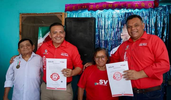En la Colonia Garcia Gineres, Vadillo Lora y Zapata Bello entregaron la medalla de identidad priista a los antiguos militantes Anita Ku y Luis Reyes Rosado Ceh, por su destacada y prolongada trayectoria apoyando al tricolor.