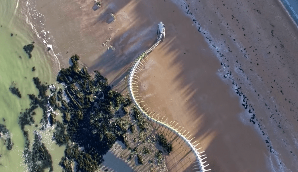 Los más desapercibidos que visiten el pueblo Saint-Brevin-les-Pins, Francia, podrían darse un enorme susto al caminar por las arenas del estuario del río Loira, a las afueras de Nantes, pues se toparían con el esqueleto de una enorme serpiente de 130 metros de largo emergiendo del mar.