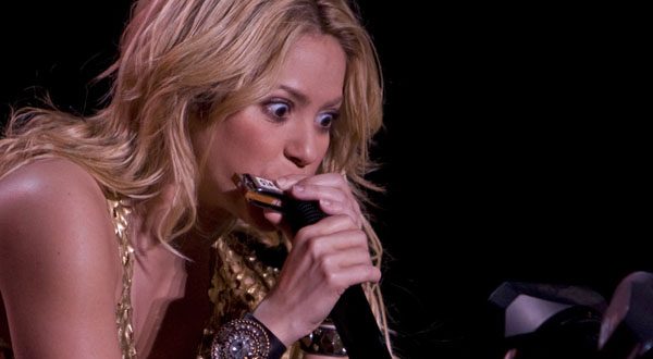 Colombia's singer and composer Shakira plays the harmonic during a concert in Bogota, Colombia, Saturday, March 12, 2011. Shakira is on a tour promoting her latest album 'Sale el sol'. (AP Photo/William Fernando Martinez)