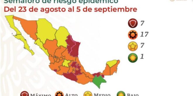 La Secretaría de Salud dio a conocer, la tarde del viernes 20 de agosto de 2021, el Semáforo COVID que estará vigente del 23 agosto al 5 de septiembre.