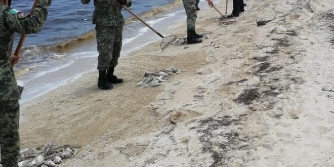 Resultado de las tareas de limpieza y vigilancia permanente que se mantiene en la zona de marea roja en Yucatán, efectivos del Ejército provenientes del 11 y 7 Batallón de Infantería y de Ingenieros de Combate, junto a personal del Gobierno estatal recogieron 1,150 kilos de peces muertos los cuales son depositados y cubiertos en 90 fosas de metro y medio cavadas para ese fin.