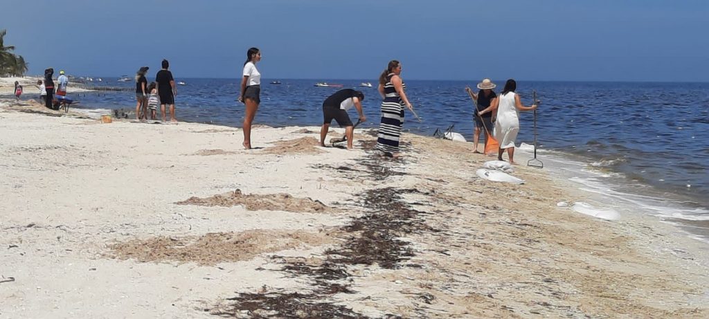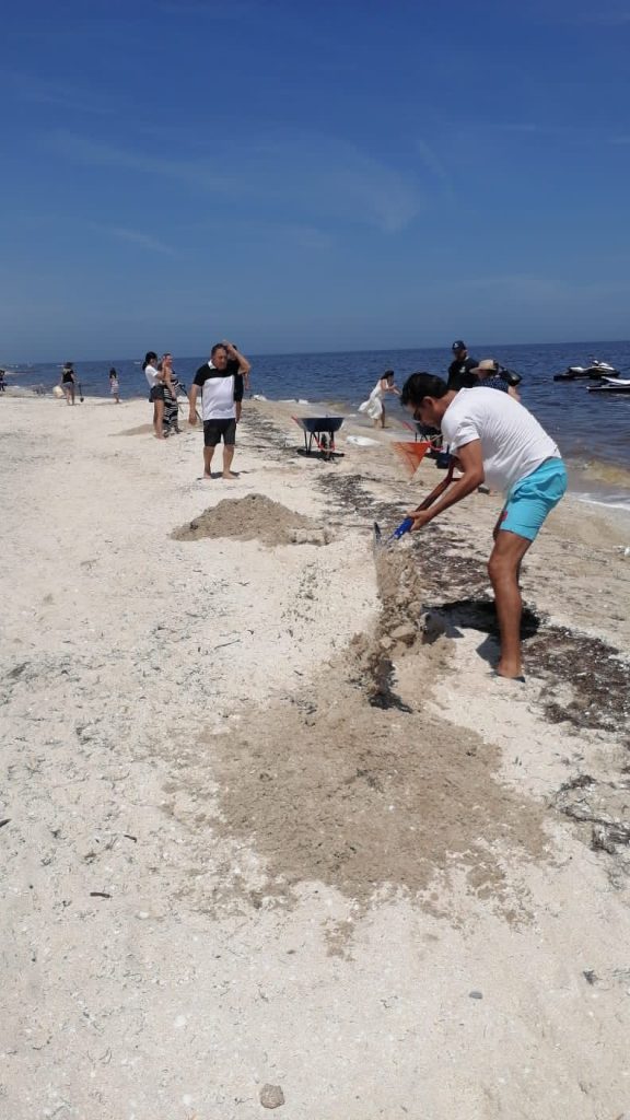 Mérida, Yucatán, 7 de agosto de 2022.- Para continuar con las labores de recoja de las especies marinas que recalan a la orilla, producto de la mancha de marea roja, personal del Gobierno del Estado realizó la limpieza de 4 kilómetros de playa en el Puerto de San Benito, labores a los que hoy se sumaron efectivos del Ejército Mexicano y veraneantes que acuden a la costa en esta temporada.