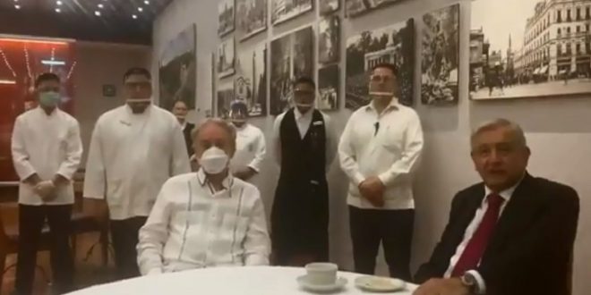 La grabación muestra a AMLO sentado junto a Tito Briz, dueño del restaurante; a espaldas del presidente había algunos empleados de la sucursal con cubrebocas y caretas protectoras.