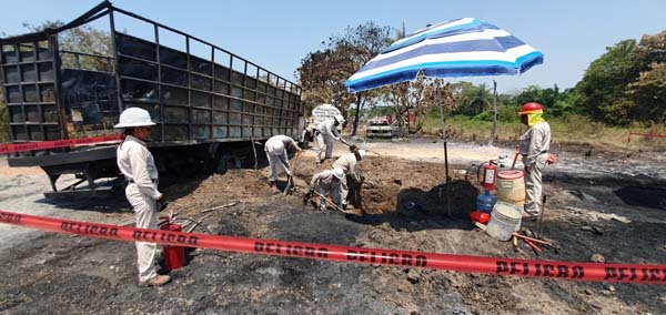 En el lugar se localizaron dos vehículos calcinados, así como implementos para el traslado de bidones de combustible, sin que se tenga reporte de lesionados ni víctimas.