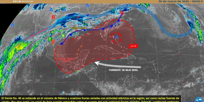 Continuará el dominio de un sistema de alta presión sobre el golfo de México, favoreciendo condiciones de cielo despejado en la mayor parte de la península de Yucatán, así como nubosidad dispersa con probabilidad para lloviznas ocasionales en el oriente y sur de los estados de Yucatán y Campeche, así como lloviznas aisladas en el sur y costa de Quintana Roo. Las temperaturas se mantendrán en rangos de calurosas a muy calurosas durante el día y cálidas al amanecer, con viento del este-sureste cambiando eventualmente al noreste de 15 a 25 km/h y rachas mayores a 40 km/h en zonas costeras de Yucatán y Campeche. Por otra parte, se espera que el frente frío No. 46 adquiera características cálidas en el noreste del país y tienda a disiparse.
