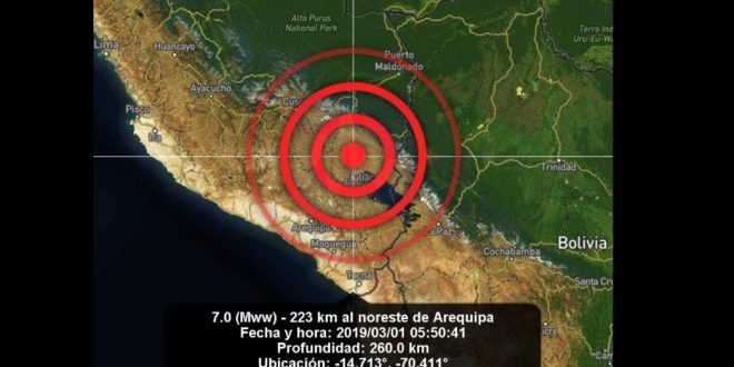 Según el Servicio Sismológico de la Universidad de Chile, el epicentro del temblor estuvo a 223 kilómetros al noreste de la ciudad peruana de Arequipa y su hipocentro se situó a 260 kilómetros de profundidad.