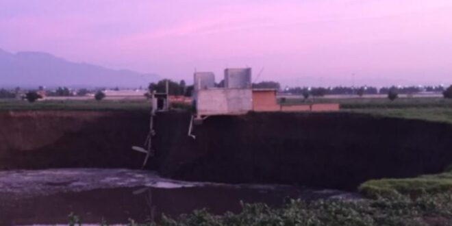 Tras quince días del surgimiento del socavón en Santa María Zacatepec, en Puebla, la casa que se encontraba a un costado terminó por caer dentro del agujero que empezó midiendo 5 metros de diámetro, pero que ahora ya cuenta con 126 metros en su eje mayor.