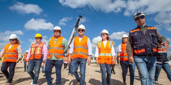 El ingeniero a cargo de la obra, Alberto Mondragón, realizó el recorrido por las instalaciones para que las autoridades constaten el avance de la misma, que se encuentra en fase de montaje de las columnas, trabes y la construcción del sistema de drenaje. Previamente supervisaron los procesos de la fabricación de dichas columnas y trabes.