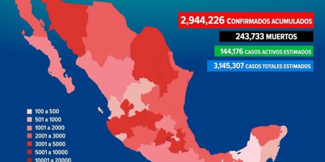 También señaló que los casos positivos estimados serían 3,145,307; mientras que los recuperados llegaron a 2,298,074. Información Excelsior.com.mx