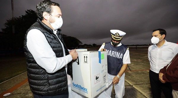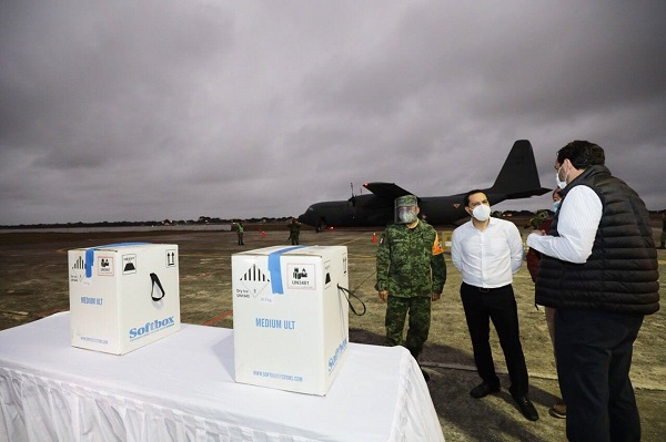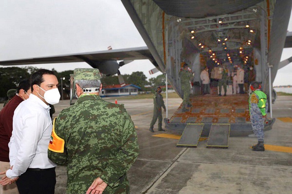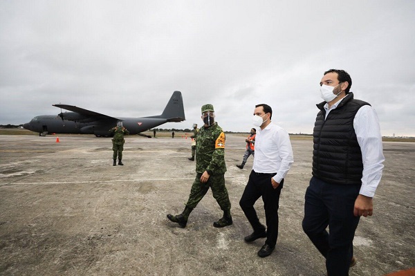 – En la Base Aérea Militar Número 8, Vila Dosal constató el arribo de las primeras 9,750 vacunas de Coronavirus, las cuales son para al personal de salud que brinda atención en las áreas Covid de 16 hospitales y clínicas del estado.