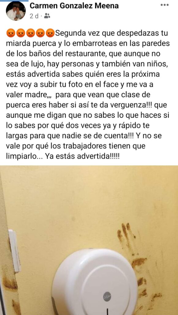 Celestún, Yuc., 9 de junio 2022.- Vaya revuelo causó la publicación de una restaurantera vecina de este puerto, quien denunció que por segunda vez un cliente le embarró con sus heces el baño el pasado fin de semana. Incluso hasta eso la comerciante fue muy cauta, reservando el nombre y foto de la persona que hizo tal puerquesidad.