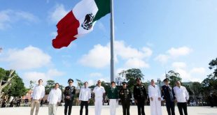 -La enseña tricolor de tamaño monumental se izó esta mañana en una ceremonia encabezada por la encargada del Despacho del Gobernador, María Fritz Sierra, en funciones del titular del Poder Ejecutivo junto con autoridades civiles y militares, como parte de las actividades con motivo de las fiestas patrias. Mérida, Yucatán, …