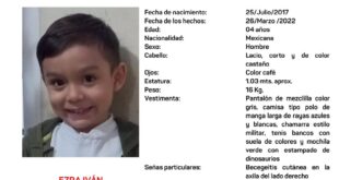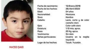 El menor fue visto por última vez el pasado 26 de abril en compañía de su abuela María Cirila Juárez Sánchez en Tecoh. MÉRIDA, Yuc., 28 de mayo 2022.- El pequeño Mateo Said Marín López, de solo 4 años, se encuentra desaparecido, por lo que la Fiscalía General del Estado de Yucatán …
