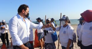 Progreso, Yucatán a 18 de abril de 2022.-Esta mañana el alcalde de Progreso, Julián Zacarías Curi acompañó a los 33 elementos del Programa de Limpieza de Playas y Ciénegas, en su labor por conservar las zonas costeras del puerto libres de residuos sólidos y contaminantes. Durante la visita, el edil …