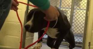 Un perro de raza pitbull que vive en un refugio de animales de California se aguanta las ganas de brincar de emoción cuando unas personas se acercan a su jaula. Al ver que una persona se acerca a su espacio con una correa en mano, ‘Benny’ -así se llama el …