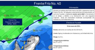 – Se espera el ingreso de ese sistema en territorio yucateco el martes 19 de marzo – Habría rachas de viento de 50 km/h con oleaje de dos a tres metros. – Se mantienen las condiciones de calor con mínimas de 22° a 25°C Mérida, 16 de marzo de 2024.- …