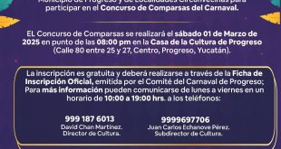 Progreso, Yucatán, 13 de enero de 2025. El Comité del Carnaval de Progreso, encabezado por la regidora Marytere Bates Hevia, en coordinación con la Dirección de Cultura, a cargo de Cruz David Chan Martínez, invitan a jóvenes y adultos del municipio de Progreso y sus localidades a participar en el …