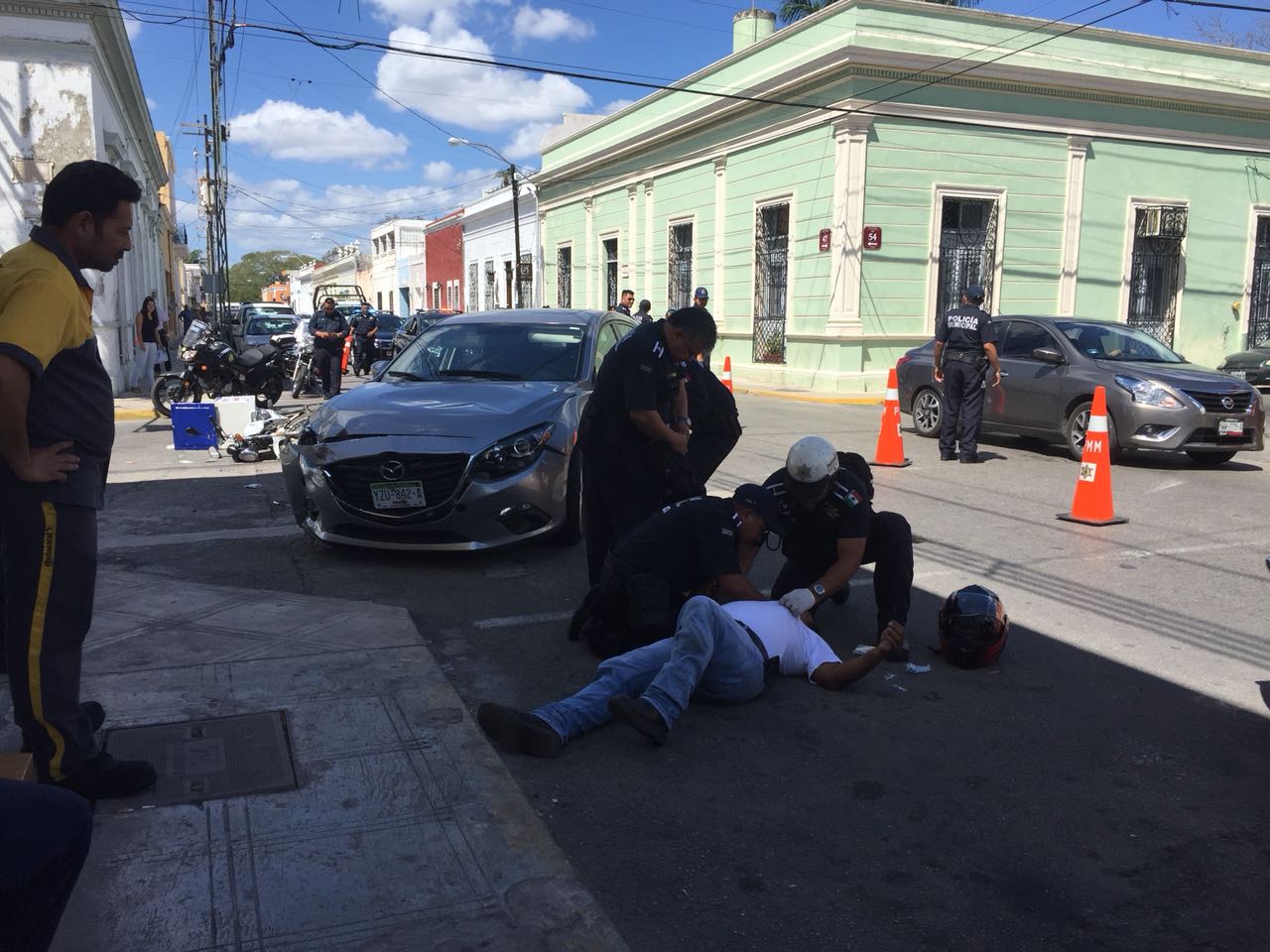 Hoy a las 11:10 horas la Policía Municipal de Mérida tomó conocimiento de un hecho de tránsito en la calle 54 por 47, en el que estuvieron involucrados el automóvil Mazda3 placas YZU-842-A y la motocicleta placas TMV9X conducidos por Miguel Angel B. P. y Victor Ernesto P. M., respectivamente. …
