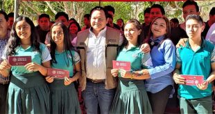 Muna, Yucatán 11 abril de 2019- Jóvenes del Colegio de Bachilleres de Yucatán, plantel Muna recibieron esta mañana la entrega de becas universales “Benito Juárez” otorgadas por el Gobierno de Mauricio Vila Dosal y Andrés Manuel López Obrador. Al hacer uso de la palabra la directora del plantel Juanita Lara …
