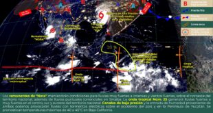 El sistema sigue aumentando de intensidad y podría convertirse en Huracán categoría 1 en la escala Saffir-Simpson durante este sábado CIUDAD DE MÉXICO.- La amplia Tormenta Tropical Nora con radio de 370 kilómetros, avanza muy cerca de la costa a 400 kilómetros al sur de Manzanillo, Colima, con vientos máximos …