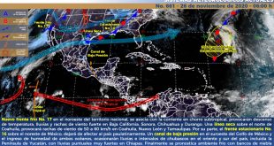 Ø Del 18 al 20 de noviembre, se pronostican lluvias y viento fuerte en regiones de Campeche, Chiapas, Oaxaca, Tabasco, Veracruz y Yucatán. Ø Los acumulados de precipitaciones podrían generar aumento en los niveles de ríos y arroyos, deslaves e inundaciones en zonas bajas. Los remanentes del ciclón tropical Iota, …