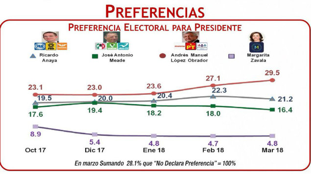 De acuerdo con la encuesta de marzo, realizada por Consulta Mitofsky, el candidato presidencial por la coalición “Juntos haremos historia”, Andrés Manuel López Obrador se posiciona arriba de las preferencias electorales con casi el 30 por ciento, por lo que se mantiene a la cabeza de los aspirantes. La encuesta …