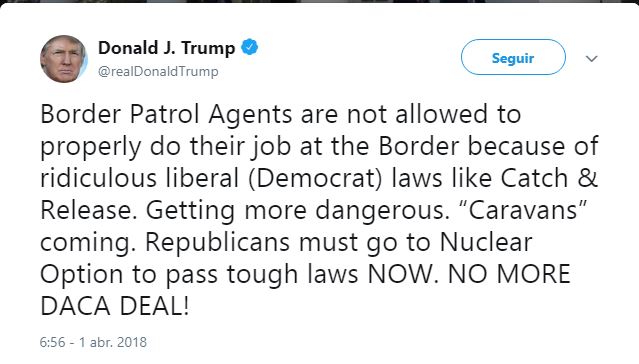El presidente estadounidense Donald Trump dijo hoy que no habrá ningún acuerdo con los demócratas para resolver la situación de los beneficiados por el programa de Acción Diferida para los Llegados en la Infancia (DACA) y pidió a los republicanos en el Congreso aprobar duras leyes en materia migratoria. “Los …