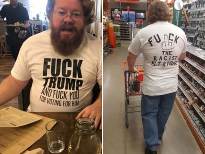 CIUDAD DE MÉXICO Andy Ternay, que vive en Texas, llevó a su esposa el domingo pasado a un restaurante y para el paseo decidió usar una camiseta con mensajes que critican al presidente Donald Trump y a los que votaron por él. Fuck Trump al fuck you for voting for him”, …