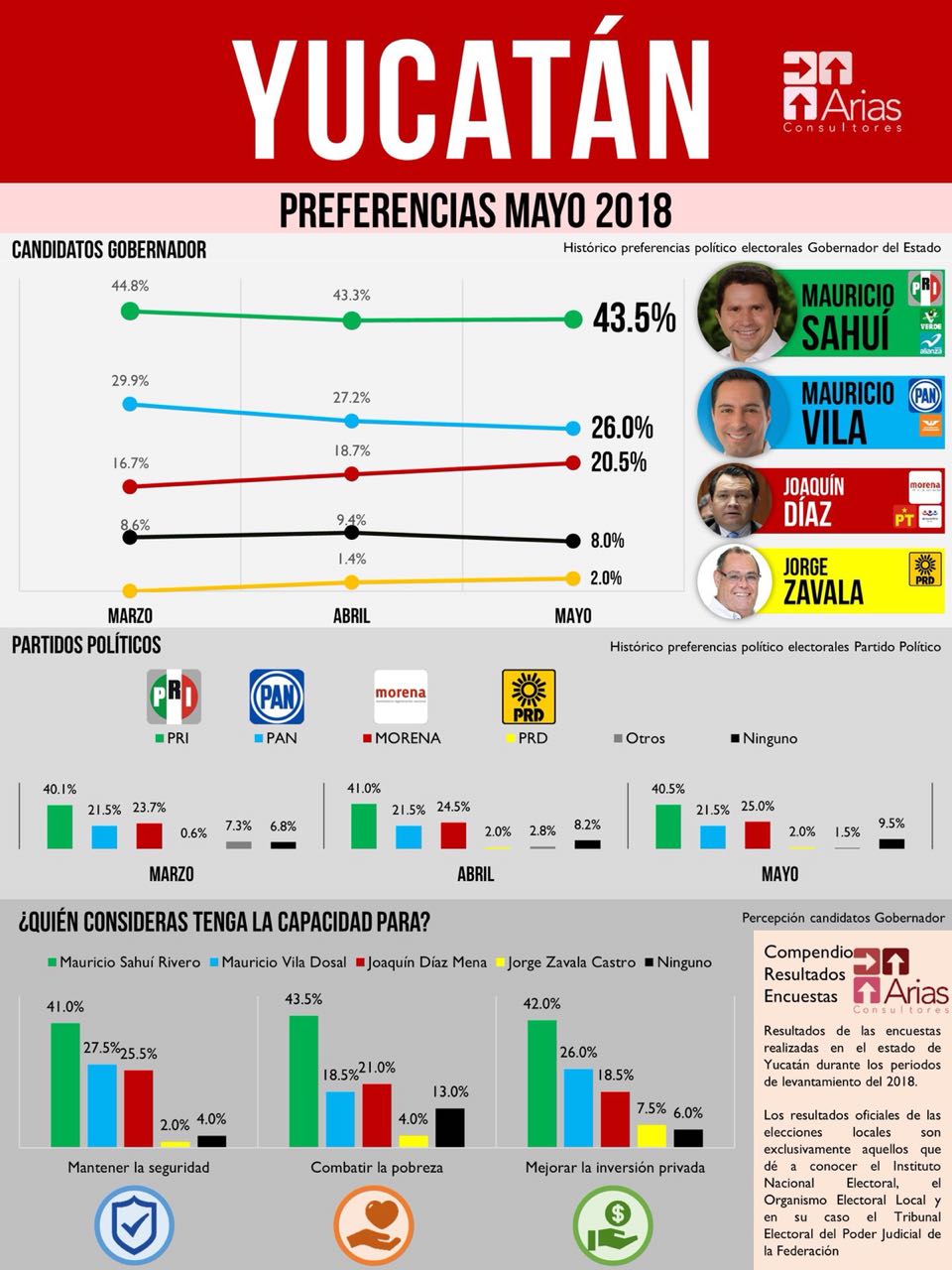 Mérida, Yucatán, 16 de Mayo de 2018.- En Mayo, rumbo a la Gubernatura de Yucatán, Mauricio Sahuí Rivero se mantiene a la cabeza en tanto que Joaquín Díaz Mena gana terreno buscando quitarle el 2do lugar a Mauricio Vila. El abanderado del PRD Jorge Zavala Castro crece ligeramente. Según este …
