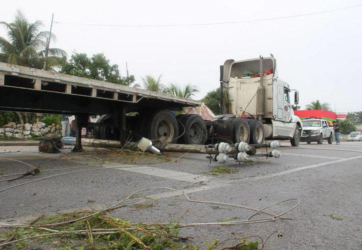 Al calcular mal el espacio para dar vuelta en una calle de la colonia San Marcos Nocoh, un tráiler se llevó dos postes de Telmex, los cables y parte de una malla perimetral de una fábrica, por lo que se desató un “gran” caos vial en la zona. El lugar es paso …