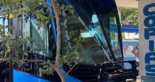 Federico Azul/ Yucatán al Instante Mérida, Yuc., a 09 de mayo 2024.- Contra el arriate de una banqueta,de un comercio en la calle 79 con 108 de la colonia Nueva Sambulá, chocó la unidad CM030 de Va y Ven, luego de que el guiador, quien bajó un momento, olvidara poner …