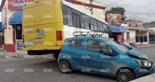 Federico Azul/ Yucatán al Instante Merida, Yuc., 20 enero 2024.- Aparatoso accidente entre un autobús y un automóvil Beat se registró en el cruce de las calles 50 y 79 cerca del Centro de la ciudad, accidente que además de daños en los dos vehículos dejó un poste de madera …