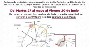 LEER MÁSAtención automovilistas: cierre parcial nocturno en el Periférico de Mérida Sur del 27 de mayo al 20 de junio