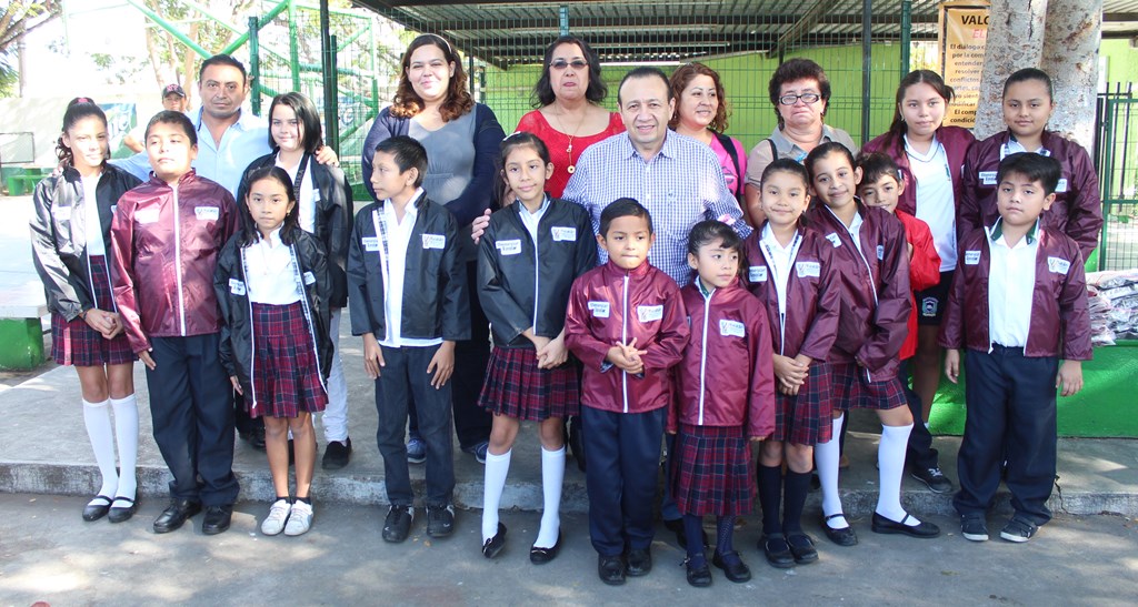 Autoridades entregan chamarras a estudiantes de educación primaria. Mérida, Yucatán.- Betina Kau Chablé y Óscar Montes de Oca Guerrero, estudiantes del cuarto grado de la primaria “Rita Cetina Gutiérrez”, estarán protegidos de las bajas temperaturas que predominan en estas fechas, gracias a las chamarras que les fueron otorgadas por medio …