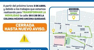 -El Gobierno estatal informó que a partir de las 10 de la noche del próximo lunes 3 de abril se restringirá el paso vehicular en las intersecciones de las calles 39 con 36 de la colonia Jesús Carranza y de la calle 39 por 28 de la colonia Máximo Ancona. …