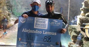 Cenotillo, Yucatán, 23 de enero de 2020.- Con el apoyo de las Secretarías de Fomento Turístico (Sefotur) y Desarrollo Sustentable (SDS), así como el Instituto del Deporte (IDEY), el apeneísta Alejandro Lemus Nava rompió el récord mundial de peso variable con una inmersión en agua dulce con mono aleta en …