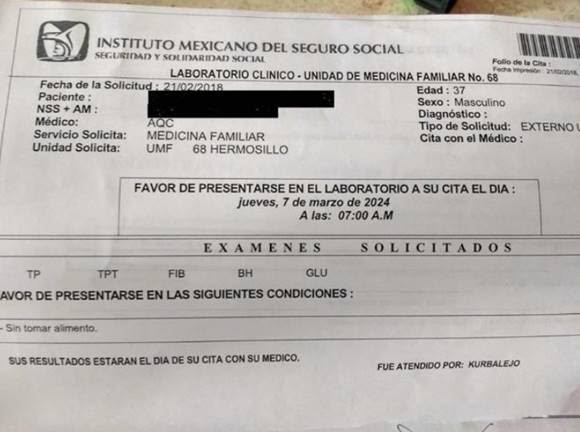 El pasado 21 de febrero un derechohabiente del Seguro Social en Sonora acudió con su médico familiar para solicitar una cita en el laboratorio. Tras la consulta con el médico, como todo derechohabiente, acudió a la ventanilla para programar la cita de los análisis clínicos. Sin embargo, el paciente se llevó tremenda sorpresa cuando la Unidad de Médica de atención Ambulatoria No. …