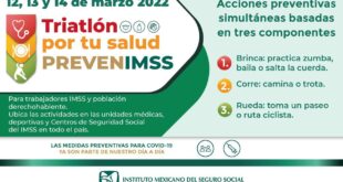 · Los días 12, 13 y 14 de marzo de 2022 participarán las 35 Representaciones estatales del Seguro Social con actividades en unidades de los tres niveles de atención. · El Triatlón se compone de tres vertientes: sana alimentación, actividad física y Chequeo PrevenIMSS. Ciudad de México, 11 de marzo …