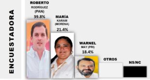 IZAMAL, Yuc., 02 de junio 2021.- Cuatro encuestadoras dan amplio margen de triunfo al panista Roberto Rodríguez en su búsqueda por convertirse en el Presidente Municipal de Izamal, con una diferencia promedio de 18.4%, en superioridad con su rival más cercano que es María Karam, del partido Morena. Los promedios …