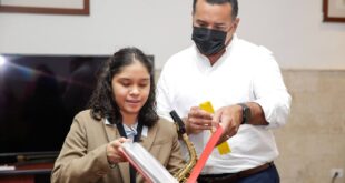 _La joven con discapacidad visual, recibió un nuevo saxofón durante el encuentro_ Mérida, 8 de septiembre de 2021. El alcalde Renán Barrera Concha recibió esta tarde la visita de la joven Mayra Gabriela Medina González, quien como meridana ejemplar, a sus 19 años ha logrado destacar en los ámbitos académico, …