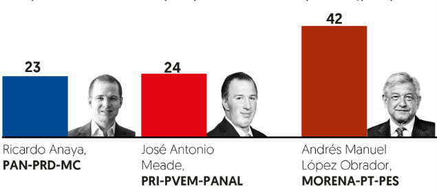 La intención de voto por Andrés Manuel López Obrador, candidato a la Presidencia por la alianza “Juntos haremos historia”, subió cuatro puntos de 38 a 42 por ciento, entre febrero y marzo, mientras que el apoyo al panista Ricardo Anaya disminuyó cuatro puntos, de 27 a 23 por ciento en …