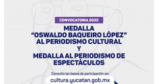 Entregará medallas y estímulos económicos de 20 mil pesos a cada recipiendario. Mérida, Yucatán, 15 de julio de 2022.- La Secretaría de la Cultura y las Artes (Sedeculta) invita a los distintos sectores de la sociedad a proponer candidaturas a las Medallas al Periodismo de Espectáculos y “Oswaldo Baqueiro López” …