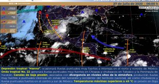 MÉRIDA, Yuc., 27 de julio 2020.- En las próximas 24 horas, se prevé cielo despejado a parcialmente nublado con probabilidad para lluvias e intervalos de chubascos, con temperaturas calurosas a muy calurosas durante el día y cálidas al amanecer. El paso de la onda tropical No. 22 sobre la península …
