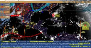 MÉRIDA, Yuc., 2 de agosto 2020. – En las próximas 24 horas, se prevé cielo medio nublado con probabilidad de intervalo de chubascos y tormentas, con temperaturas calurosas a muy calurosas durante el día y cálidas al amanecer. Una vaguada inducida en el oriente de la península de Yucatán, mantendrá …
