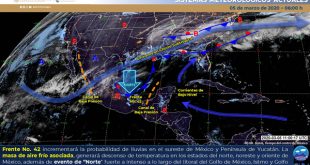 MÉRIDA, Yuc., 06 de marzo 2020.- En las próximas 24 horas, se prevé cielo medio nublado a nublado con probabilidad de lluvia dispersa, con temperaturas cálidas durante el día y templadas a cálidas durante la madrugada. La masa de aire frío y el frente frío No. 42 ocasionaran condiciones de …