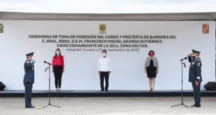 Valladolid, Yucatán, 21 de septiembre de 2020.- El Gobernador Mauricio Vila Dosal asistió a la ceremonia de cambio de mando de la Comandancia de la 32 Zona Militar, que desde este día asumió el General de Brigada Diplomado de Estado Mayor, Francisco Miguel Aranda Gutiérrez, quien sustituye al General de …
