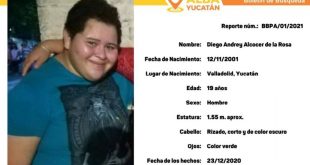 MÉRIDA, Yuc., 15 de enero 2021- Una vez más, las autoridades estatales emitieron la alerta para tratar de localizar a Diego Andrey Alcocer de la Rosa, de 19 años, quien desde el pasado 23 de diciembre salió de su casa en Valladolid y hasta ahora no se le ha podido …