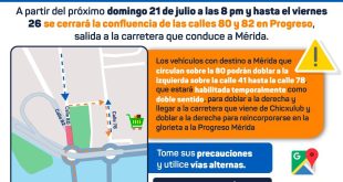 -El Gobierno del Estado informa que a partir del próximo domingo 21 de julio a las 8 de la noche, se cerrará, hasta nuevo aviso, el tramo de la calle 80 en su confluencia con la calle 82 de este puerto, por lo que se habilitará, de manera temporal, la …