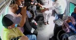 Los pasajeros no se dejaron amedrentar por las amenazas del delincuente Un delincuente intentó asaltar a un grupo de pasajeros en una combi, pero terminó por ser echado del vehículo cuando uno de los hombres lo empujó con su mochila por la puerta. El incidente captado en video por la …